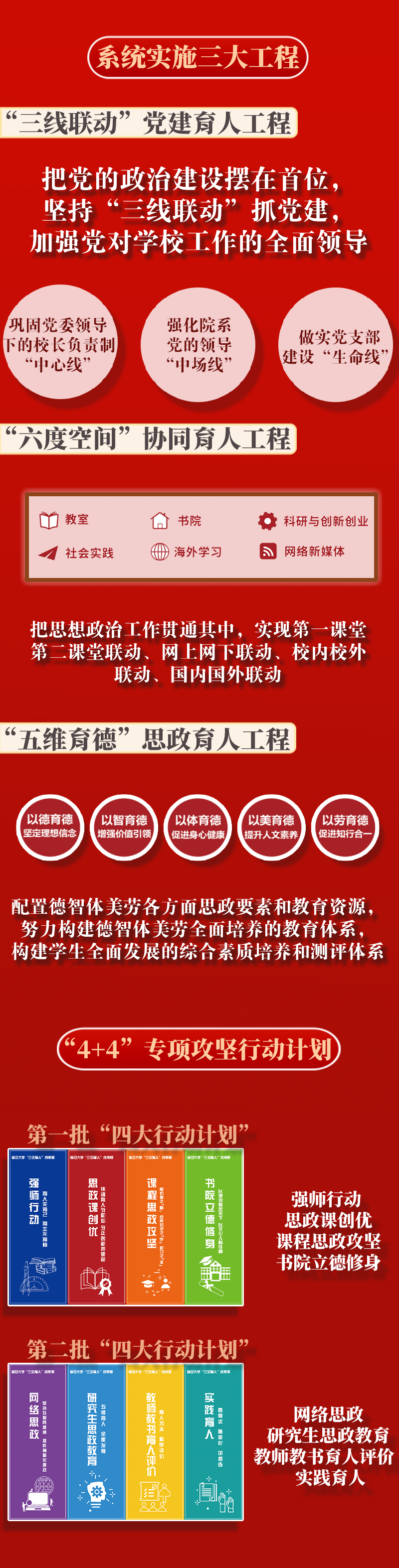 一是坚持价值导向,落实三线联动,传承红色基因,用好抗疫课堂,突出党建引领。二是坚持问题导向,2019年重点推进思政课创优、课程思政攻坚、书院立德修身、全面强师4大行动计划,2020年又压茬推进研究生思政、实践育人、网络育人和评价体系4大行动计划,破解关键难题。三是坚持改革导向,构建“思政课程+课程思政”的一体化课程体系、“学生+教师”的一体化实践体系、“育人+科研+社会服务”一体化评价体系等,突出系统集成。四是坚持基层导向,重视发挥教师育德育人主体作用、学生立德成才主体作用、机关院系办学主体作用。