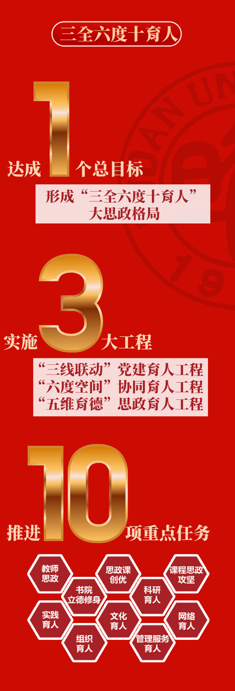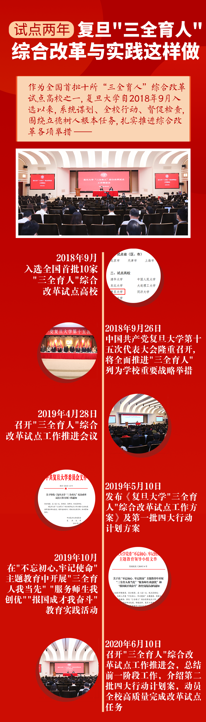 在教育部“三全育人”综合改革试点布局中,上海是首批试点地区,复旦大学、同济大学是首批试点高校。目前,上海的试点工作已形成4大特点:一是建立高规格的统筹协调机制,由市委副书记担任市委高校思政工作领导小组组长,组宣统三位常委同志和分管副市长担任副组长,20多个委办局参加,是全市教育系统规格最高的议事协调机构。二是形成三圈三全十育人,内圈聚焦第一课堂育人主渠道,中圈聚焦素质教育第二课堂,外圈聚焦整合社会资源,服务高效率,通过实施开门办思政,构建全社会关心支持全育人的大格局。三是探索大中小学思政课一体化路径,依托高校及其附属中小学率先试点,按照规定设计大中小学思政课内容,促使大中小思政课程和教学分层递进、螺旋上升、整体衔接。上海的实践表明,加强思政理论课程教学是推动习近平新时代中国特色社会主义思想三进的主要渠道,需要坚持改革创新,与时俱进,持续提高课堂育人实效。四是做强高校课程思政和中小学学科德育。我们将在教育部的支持指导下,进一步加强探索创新,统筹各领域各环节各方面的育人资源和育人力量,推动知识传授、能力培养和理想信念、价值理念、道德观念等教育基础,整体构建三圈实体。
